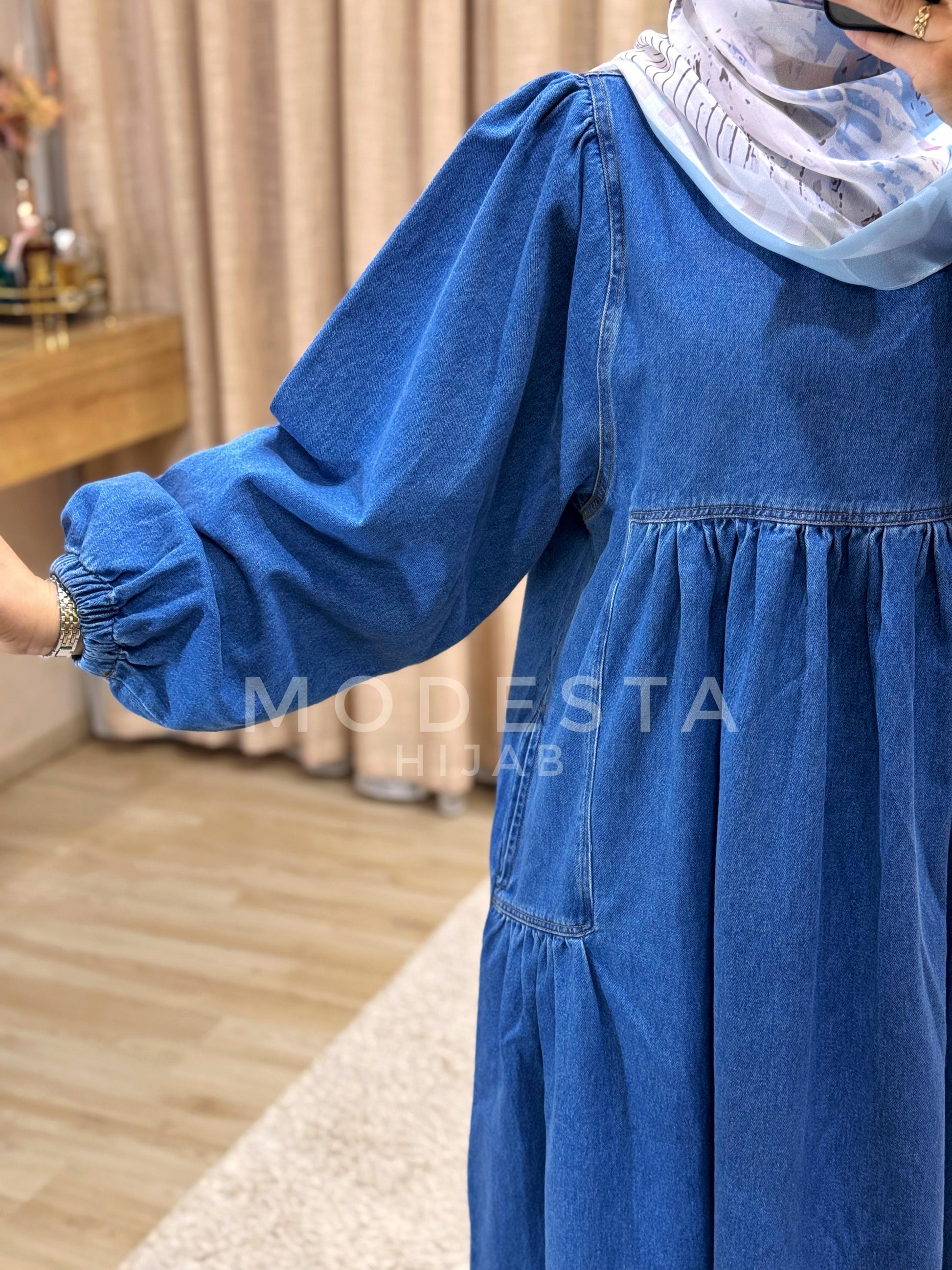 أضيفي لمسة من الأناقة العصرية إلى خزانتك مع هذا الفستان الجينز الراقي، المصمَّم ليناسب إطلالات الخريف والشتاء. يتميّز بقماش جينز عالي الجودة، مع أكمام منفوشة تضيف أنوثة وجاذبية للموديل. الفستان مزوّد بجيوب عملية تضيف لمسة من الراحة والعملية.